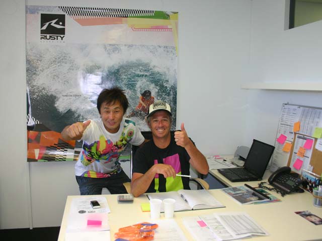 ①撮影前日 ゴールドコーストにあるラスティ支社(本社パース)を訪れると支店長のコリー(Cory)が笑顔で出迎えてくれました。②改装工事中のラスティ ゴールドコースト支店 ③左からコリー、日本大好きのミック(Mick)と今回 私のお世話をしてくれた現地在住のサーフィンインストラクター ノビー(Nobby)です。何やら怪しげな相談をしているように見えますが、、、、 ①ラスティクロージング メンズはかなり いい感じできています。②チックス(CHIX)世界的にウイメンズはこう呼ばれています。かわいいの一言です!!③コリー しぶめのクールガイでサーフィンもバリバリです。 ①撮影当日 午前9時集合 私達が着いたら今回のモデルでラスティライダーのジェイク・シャープ(20歳)(Jayke Sharp) 車で2時間かけて 来てくれていました。右の方もお世話してくれた寿司屋のジロー君 オフィスにはラスティサーフボードがご覧のようにズラリと並んでいます。②早速 ラスティウエットの撮影開始 ③ウイメンズウエットスーツのモデル サラ(Sara) オフィスでの写真もほどほどにしてやっぱりビーチでサーフィン!その前に 暑い中ジェイクにウエット着てもらいイメージ写真をパシリ!快く引受けてくれました。 そして ボードショーツだけで海に入るや否やエアーを決めるはチューブに入るはさすが オーストラリア ジュニアチャンピン デュランバー(D Bar)でも 他のサーファーの視線をくぎづけです。バーレーヘッズも昔と同様いい波立っていました。 ジェイクは今年8月に行われる6スターWQSコンテストで初来日するそうです。 オーストラリアのサーフィン雑誌には数えきれないほどラスティ広告やライダー達の活躍が紹介されていました。 そしてこちらはジョシュ・カーやジェイクのボードをシェープするジェーソン・ロッド(Jason・Rodd)とマネジャーのリョウイチ・サトーさん 日本でもJRブランドで発売されています。要チェックです。 もうすぐ オーストラリアにサーフィン修行に行く田村プロも彼にサーフボードをシェープしてもらう予定です。 20年ぶりにゴールドコーストでした。特に変わった様子はなかったように思います。ビルが増えたり道路がきれいになったりでした。ただ 当時よくサーフィンしたキラポイントがビーチだらけになってなくなっていたのが残念でした。 20年前に行った時も仕事で行きました。仕事と言ってもコンテストのジャッジです。当時 私は日本国内でIPS(現在のASP)のコンテストのジャッジをしていて 千葉や新島によく出かけていました。その流れでバーレーヘッズで 毎年行われたASPのコンテストにジャッジとして日本の代表で参加しました。確か6日間で一日100ドル 合計600ドルを外国でサラリーとしてもらった初めての経験です。 その大会の事は今でもよく覚えていて トム・カレンが優勝!2位にはマイク・ランブリージでした。そのヒートのジャッジをしていた私は 初めて恐るおそる10点満点をジャッジペーパーに書きました。私の中ではトム・カレンのそのライディングは10点満点以外に考えられなかったのです。他の4人のジャッジが8点とかだったらどうしよう、と思いながらです。結果 全員のジャッジが10点満点、今でこそ10点満点はよく出ていますが 当時 10点満点をつけると言うのはすごい勇気がいった事でした。 そんな感じのオーストラリア ゴールドコーストです。 RUSTY-JAPAN KAMA 2009年2月4日(水) 御得意先様 各位 拝啓 晩冬の候、ますます御健勝のこととお慶び申し上げます。平素は格別のご高配を賜り、厚く御礼申し上げます。 さて、弊社はこの度海外研修の為、誠に勝手ながら下記の通り臨時休業させて頂きます。 何かとご迷惑をお掛けすることと存じますが、あらかじめご了承下さいますよう、お願い申し上げます。 敬具 <記> <休暇期間> 2009年2月6日(金) ~ 2009年2月10日(火) <業務開始日> 2009年2月12日(木)より、通常営業致します。 <その他> 休暇期間中、お急ぎの際には担当営業の携帯電話の方へご連絡頂けますよう お願い申し上げます。 以上 RUSTY-JAPAN (有)オフザウォールインターナショナル 1月に22日~24日 アメリカ サンディゴで行われたASRトレードショー報告です。