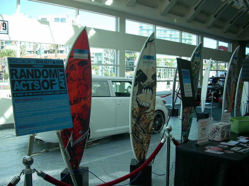 またまたやって来ました>>2008ASR 皆さんご存知の通り、世界中から横乗り系アクションスポーツ・メーカーが “この秋・冬、うちはこんな感じで行きまっせー!!” って発表するわけです。 当然そのメーカーが気になる世界の横乗り系アクションスポーツ関係者や その世界中の横乗り系アクションスポーツ・メーカーにスポンサーを受けている 有名ライダー達も一同に集結するわけです。 それがACTION SPORTS RETAILER 『ASR』なんです。 実は今回のASR、すっかり忘れてました。 チケットも持ってないけど、「まぁ何とかなるやろ」 って事で出発。 僕の家からASR会場までは車で10分。 「こんな近くに住んでるのに入られへん訳が無い!!」 と訳の分らん事を思いながら、 運良く会場近くに駐車する事にも成功!! 「幸先いいぞ~!!」って気合を入れて会場入り。 会場入ってすぐ、まず目に飛び込んできたのがコレ!! これは自動車の“SCION”と地元FM局の“FM94/9” そして我らが“RUSTY SURFBORD”の共同企画。 地元ラジオ局の“FM94/9”がおもにサウザン・カリフォルニア出身のアーティストを選出、 そのアーティストが“RUSTY SURFBORD”に様々なグラフィックを描き、 応募した人達に、そのサーフボードをサンディエゴ内の “SCION”販売店で抽選してプレゼント!! 時間が無いけど僕も応募しときました。 そして、その次に目に飛び込んできたのがコレ!! コレ“RUSTY BOARDSHORTS”の広告ブース。 なんとコノBOARDSHORTS、ペットボトルのリサイクルで 出来てるみたいなんです。 その上“伸縮性”“乾燥性”にも優れてるみたいなんです。 まさに夢のBORADSHORTSなんですね~。 会場入り口をウロウロする事1時間。 あの手この手で中に入ろうとしたんですが 結局、会場内への潜入は失敗・・・・。 来週からは“トラッセルズ”で 『ASP BOOST MOBILE PRO』が開催されます。 また、報告しますね。 RUSTY-USA “MART” 今月号のSURFING誌とSURFER誌 そして日本国内のフリーマガジン”FLOW”ご紹介させていただきます。