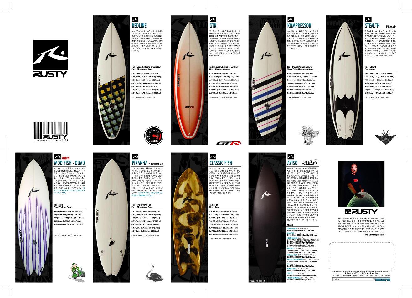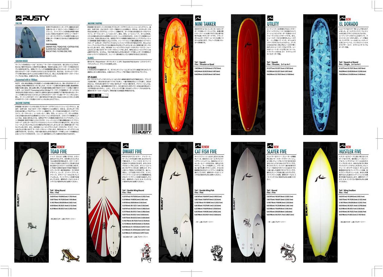 官公庁、多くの企業では新年度がスタートです。今年度もRUSTYブランドをどうぞ宜しくお願い申し上げます。 さて、この新年度初日に向け2010RUSTY SURFBOARDSのラインナップが堂々発表されました! 昨日、全国のRUSTY DEALERSに一斉にカタログを発送しました。 ふぅ・・・、何とかこの日に間に合いました・・・(汗) 先程、DEALERさんからお電話を頂き、カタログ着きましたよ~。っと、カタログえらい気合い入ってますね~!っと、このボードくださ~い。っと。 トントン拍子に、毎度ありがとうございます!! えらく気合いの入ったカタログと巷で噂のあれを本邦初公開! ジャンッ!! RUSTY SURFBOARDSの気合を感じて頂けましたか・・・? 気になるライナップは、 ニューモデルが2モデル! SLAYER FIVE、EL DORADOが満を持しての登場です。 そして、そしてHUSTLER FIVE、MOD FISH/QUAD、TOAD FIVE、CAT FISH FIVE、FLING DISC FIVEがリニューアルされました。 今季、爆発的ヒットな予感のSLAYER FIVE!! 今季は大きくHI PERFORMANCE、ALTEINATIVE、SPECIALTY と3シリーズに分かれています。 HI PERFORMANCEシリーズはベーシックボードを集めたシリーズです。まずこの中から一本お選び頂くことをお勧めします。 ALTEINATIVEシリーズは遊び心いっぱいのスペシャルボードばかりを集めたシリーズです。乗り手の要望に応えてくれます。 SPECIALTYシリーズはロングボードを含めたシリーズ。特別な日の特別なサーファーにお勧めのボードもこのシリーズにあります。 AVISOシリーズは10モデルからなる中空構造、オールカーボンファイバー製のAIVISOボードシリーズです。 TUFLITEシリーズ タフライトのシリーズで2モデル各6サイズ、3カラーのラインナップ。 と、世界中のサーフボードブランドのどこにも負けない渾身のフルラインナップです! これだけバリエーション、モデル、素材が多くあるブランドは他には聞いたことがありません。世界のRUSTYだからできるんです。 皆さん、安心・信用してRUSTYのサーフボードにお乗り下さい。 ムムム、春の嵐が吹き荒れてますね~ う~ん!?朝練行っちゃう~!? あっ、そう言えば今日嘘つくん忘れてた・・・(笑) RUSTY-JAPAN NOZAWA |