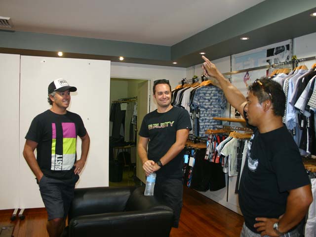 ①撮影前日 ゴールドコーストにあるラスティ支社(本社パース)を訪れると支店長のコリー(Cory)が笑顔で出迎えてくれました。②改装工事中のラスティ ゴールドコースト支店 ③左からコリー、日本大好きのミック(Mick)と今回 私のお世話をしてくれた現地在住のサーフィンインストラクター ノビー(Nobby)です。何やら怪しげな相談をしているように見えますが、、、、 ①ラスティクロージング メンズはかなり いい感じできています。②チックス(CHIX)世界的にウイメンズはこう呼ばれています。かわいいの一言です!!③コリー しぶめのクールガイでサーフィンもバリバリです。 ①撮影当日 午前9時集合 私達が着いたら今回のモデルでラスティライダーのジェイク・シャープ(20歳)(Jayke Sharp) 車で2時間かけて 来てくれていました。右の方もお世話してくれた寿司屋のジロー君 オフィスにはラスティサーフボードがご覧のようにズラリと並んでいます。②早速 ラスティウエットの撮影開始 ③ウイメンズウエットスーツのモデル サラ(Sara) オフィスでの写真もほどほどにしてやっぱりビーチでサーフィン!その前に 暑い中ジェイクにウエット着てもらいイメージ写真をパシリ!快く引受けてくれました。 そして ボードショーツだけで海に入るや否やエアーを決めるはチューブに入るはさすが オーストラリア ジュニアチャンピン デュランバー(D Bar)でも 他のサーファーの視線をくぎづけです。バーレーヘッズも昔と同様いい波立っていました。 ジェイクは今年8月に行われる6スターWQSコンテストで初来日するそうです。 オーストラリアのサーフィン雑誌には数えきれないほどラスティ広告やライダー達の活躍が紹介されていました。 そしてこちらはジョシュ・カーやジェイクのボードをシェープするジェーソン・ロッド(Jason・Rodd)とマネジャーのリョウイチ・サトーさん 日本でもJRブランドで発売されています。要チェックです。 もうすぐ オーストラリアにサーフィン修行に行く田村プロも彼にサーフボードをシェープしてもらう予定です。 20年ぶりにゴールドコーストでした。特に変わった様子はなかったように思います。ビルが増えたり道路がきれいになったりでした。ただ 当時よくサーフィンしたキラポイントがビーチだらけになってなくなっていたのが残念でした。 20年前に行った時も仕事で行きました。仕事と言ってもコンテストのジャッジです。当時 私は日本国内でIPS(現在のASP)のコンテストのジャッジをしていて 千葉や新島によく出かけていました。その流れでバーレーヘッズで 毎年行われたASPのコンテストにジャッジとして日本の代表で参加しました。確か6日間で一日100ドル 合計600ドルを外国でサラリーとしてもらった初めての経験です。 その大会の事は今でもよく覚えていて トム・カレンが優勝!2位にはマイク・ランブリージでした。そのヒートのジャッジをしていた私は 初めて恐るおそる10点満点をジャッジペーパーに書きました。私の中ではトム・カレンのそのライディングは10点満点以外に考えられなかったのです。他の4人のジャッジが8点とかだったらどうしよう、と思いながらです。結果 全員のジャッジが10点満点、今でこそ10点満点はよく出ていますが 当時 10点満点をつけると言うのはすごい勇気がいった事でした。 そんな感じのオーストラリア ゴールドコーストです。 RUSTY-JAPAN KAMA 2009年2月4日(水) 御得意先様 各位 拝啓 晩冬の候、ますます御健勝のこととお慶び申し上げます。平素は格別のご高配を賜り、厚く御礼申し上げます。 さて、弊社はこの度海外研修の為、誠に勝手ながら下記の通り臨時休業させて頂きます。 何かとご迷惑をお掛けすることと存じますが、あらかじめご了承下さいますよう、お願い申し上げます。 敬具 <記> <休暇期間> 2009年2月6日(金) ~ 2009年2月10日(火) <業務開始日> 2009年2月12日(木)より、通常営業致します。 <その他> 休暇期間中、お急ぎの際には担当営業の携帯電話の方へご連絡頂けますよう お願い申し上げます。 以上 RUSTY-JAPAN (有)オフザウォールインターナショナル 1月に22日~24日 アメリカ サンディゴで行われたASRトレードショー報告です。