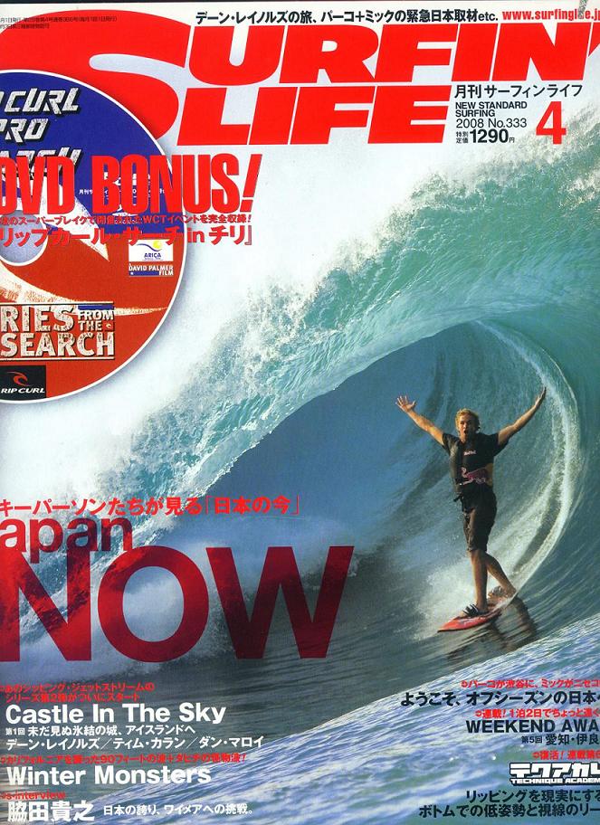 もの凄い水量で形成された分厚いリップの下をトウインサーフィンにて抜け出し、余裕のフィニッシュ! 本文中にはこの写真が撮られた時の詳細が載ってます。場所はTAHITIのTEAHUPOO!!ビックウェーブポイントで知られるチョープーで撮影されたもの。 2007年10月下旬に、大規模なストームが発生し、この上ないグランドスウェルが入りそうということで、蒼々たるメンバーがチョープーのラインナップに勢揃いしたようです。その中でもパイプラインマスターの実力を発揮し、トウインでも実力を実証してくれました。 その他にも、本文中の「日本の今」という特集でAerialを語る日本のエアーマスター森 哲太プロのインタビューでも、一番注目しているエアリストはジェイミー・オブライエンという事で、エアーの高さ・回転の質で世界の先頭にいて、森プロ自身もジェイミーのビデオなどを参考にしているようです。 飛んで・回って良し!デカ波いかせても良し!凄いサーファーです。どちらかと言うと玄人好みなサーファーですが、色々なメディアに出てきますので益々注目のサーファーです!! しっかし、このフットワークの軽さには脱帽です・・・。 今回のSURFIN'N LIFE 4月号には、先日マレーシアで行われたQuiksilver Revolution2.0の記事にもJosh Kerrが出てたり、昨年チリで開催されたWCTイベントが収録された付録DVDにも、トライアルから勝ち上がり本戦にも出場したChristian Merdloが出てたりと多くのRUSTYチームライダーが世界中で活躍していることを実証!! たくさんのRUSTYチームライダーが2008年も世界中で活躍してくれる事は、本当に我々の誇りです。 RUSTY-JAPAN NOZAWA 少しづつではありますが、春の気配がようやく感じられるようになった今日この頃。我々サーファーが一番辛い、寒い・冷たい海からもうすぐお別れできますね!いやぁ~今年も長い冬でした。と言ってもまだまだ水温は上がってきませんが・・・。外気が暖かくなって、気持ち的にはもちろん、着替え時のあの鳥肌とはもうおさらばです。