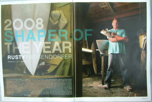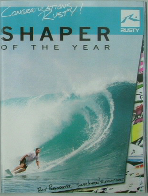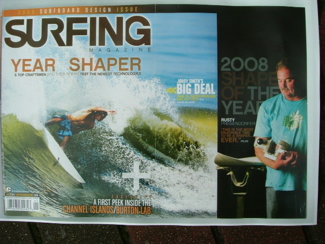 RUSTY Surfboards Wetsuitsの RUSTY-JAPAN 有限会社 オフザウォールインターナショナルは 2008年1月4日(金)より いたしております。 RUSTY Clothingの RUSTY Company ニッキー株式会社は 2008年1月7日(月)より 営業いたします。 今後ともRUSTYブランドよろしくお願い申し上げます。 RUSTYブランドスタッフ一同 PR RUSTY PPREISENDORFER 私たちの身近にいるあの男”RUSTY”がついに念願のSHAPER OF THE YEAR 2008に選ばれました。世界のサーフィン業界ではすごい事なんです。シェーパーとして世界一に輝いたのです。しかもUSA SURFING MAGAZINEのカバーショットまでゲットです!!USA SURFER MAGAZINEは世界一のサーフィン雑誌と言っても過言でないほど、どこの国の空港でも販売されているメジャー誌です。そのカバーをシェーパーであるRUSTYが載るなんて快挙です。多くのシェーパー達も驚いています。通常カバーはサーフィンのショットです。もちろん今回も 売出中のニューカマー”Jordy Smith"(南アフリカ)と一緒のカバーですが シェーパーの載るのは記憶にありません。