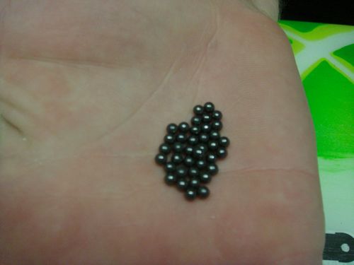 そこでまず目に入った物はシェイプルームに横たわる、前回見たあのジェイミー・オブライアンのデッカイ波用のサーフボード!! 早速話しを聞いて見ると、ジェイミーが先週末そのサーフボードを取りに来たけど、“まだ軽すぎる。”と注文があったため、約4キロだったサーフボードを約7キロにしている最中との事。 そして、そのサーフボードに使われてるのが、下の写真の物。 何かわかりますか?これは散弾銃の弾に入ってる鉄の玉です。この小さな鉄の玉をデッキの中に何百個も埋め込む事でスゴイ重さのサーフボードに仕上がってました。 持ってみて感じた事は、この重さのサーフボードが水に浮くのかな?って事です。RUSTY JAPAN担当クリス曰く“大丈夫!!このサーフボードはジェットスキーで引っ張って、僕達の想像を絶するスピードで走るからね!!”との事。その言葉を聞いても信じられないくらい重かったです。 サーフボードが重いって文句をいってるサーファーは何人も見た事があるけど、軽いって文句言うサーファーがいるとは・・・世界は広いっす。 RUSTY USA-SD MART PR ライダーズ情報