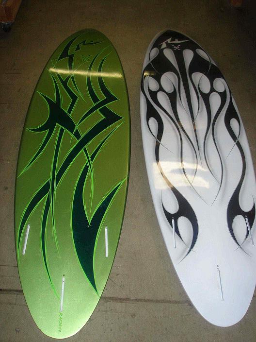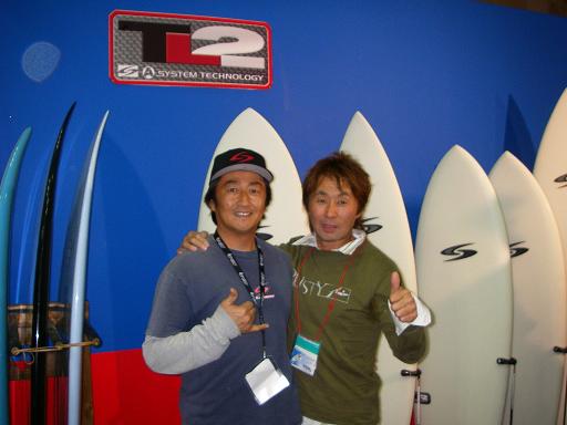 早速、この間RUSTYの工場に行って見つけてきた新しい物。 写真のボードがそれです!!名前は“VX”。もちろんまだ試験段階の未発表ボード。緑色の方はすでに今年初めのタバルアでティームライダーの“ジェミー・オブライアン”が気に入って乗っていたボードで、その隣の白と紫の方がそのジェミーに新しく送るボード。 軽さはEPSにスゴク似ていて軽い!!触った感じは滑らか・スベスベ。表面に描かれてるデザインはカスタムカー並にキレイ!! “もしかしたら、ジェミーがこの板でとんでもないサーフィンしてるのが雑誌に出るんちゃうか!!”って思ったので一杯触っときました。 こんな感じで、また登場します。ほなまた・・・・。 RUSTY USA SD-MART PR THE TOAD