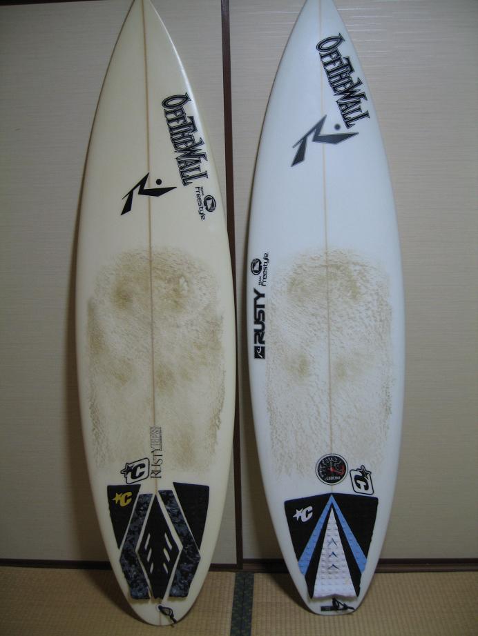 今回オーダーしたREDLINE EPS(6'0"-18.0-2.3)は前回オーダーしたTHUMBTAIL EPS(6'0"-18.25-2.25)よりワイドを狭め、厚みを前より厚くしてみました。(自分は身長175cm/体重64kg、NSA1級。) *REDLINE *THUMBTAIL *アウトライン比較 初期のEPSはやはり黄ばみが目立ちますが、さすがは世界のRUSTY、しかっかり進化し今では真っ白です。 乗り比べた結果、浮力は前のTHUMBTAILより断然あり、テイクオフは更に速くなった!いつもオーバフロー気味になるようにオーダーしてるのですが、今回も思った通りの仕上がりでした。 幅の0.25インチより厚みの0.05インチの方が浮力があるように自分は感じます。 動きは、幅を0.25インチ狭めた分ターンはかなりしやすく、動きが敏感ですごく良いです!それとリップへのパンチは前のに比べ、更に速く蹴り込んだ時の反応は抜群です。 しかし、幅を狭めるとやっぱり安定感は違いますね。厚みも安定につながるけど、幅のほうが安定感は増しますね。 あと、僕はここのところEPSしか乗っていません。なぜならすごく調子が良いからです。EPSに乗るときは常に体重を乗せるように乗ります。蹴り込んだ後、ターンをした後、体重を抜けきった状態を作らないように意識します!常に踏み込んでいくように!そうする事で、よりスピードが付き、アクションの時により爆発的な力が発揮できます。 皆さんのオーダーの参考にして頂けたらと思います。 RUSTY-TEAM RIDER Masayuki"MASA"Shibano |