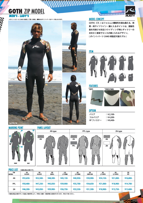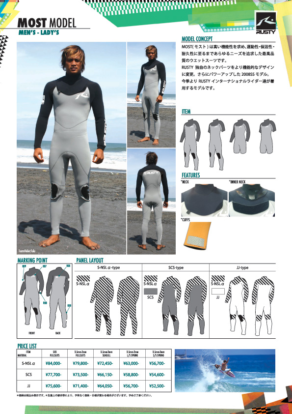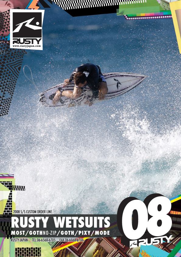私はこの冬からドライスーツ(MARVERICKS)を着てたので、だいぶ快適でした!!ドライスーツ最高ーッ!!そして、ありがとうドライスーツ!!!!皆さんも是非お試し下さい。 今週からRUSTY WETSUITS 2008SPRING&SUMMERのカタログが全国のRUSTY WETSUITSディーラーに配布されました。 この春夏の特徴を一言で言うならば【CORE&COOL】 新しくニューカラーが3色増えて、中でもRUSTY独自のカモフラージュ柄はかなりCOOLな色合いです。その他にも全世界統一のロゴマークを使用してとってもCORE! 最上級モデルのMOSTは今年よりRUSTYインターナショナルライダー達が世界の各地で着用します!!その他のモデルも運動性・機能性・デザイン性の全てにおいて進化!!Rustyさんが信念とする"サーファー一人ひとりが求めるものへの追求"を実践し、かなりの仕上がりです。 まだRUSTY WETSUITSを着たことがない方も一度お試しください。損はさせませんよ!日頃からご愛用頂いております皆様も買い替えの時には是非!! 今年の春夏もRUSTY WETSUITSを宜しくお願い申し上げます。 RUSTY-JAPAN NOZAWA RUSTY MARVERICKSドライスーツ試着