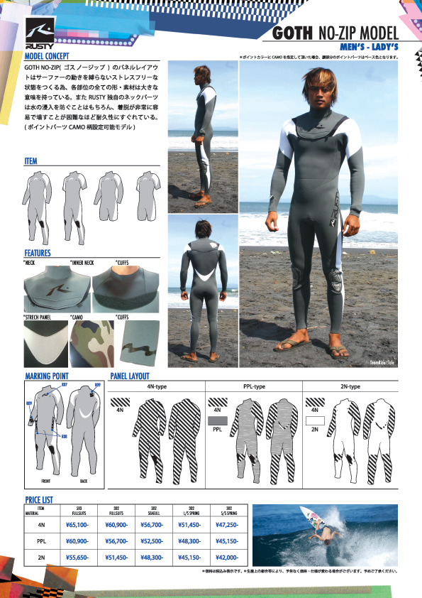 しかしっ!!ええ波ときたら行くしかないんです!温かい海外逃亡もひとつの手段ですが、やはりキ~ンッと頭に響くドルフィンをしなくてはなりません・・・。辛いですね。 今期のRUSTY WETSUITS FW モデルはお陰様で多くのオーダーを頂戴致しております。誠にありがとうございます。 一部のモデルは多少制作に時間を頂きご迷惑をお掛け致しておりますが、ほとんどのモデルは3週間以内の仕上がりを今もお約束させて頂いております。まだ冬用のウエットスーツを手に入れられてない方は、お近くのRUSTY WETSUITS DEALERSへ!今なら12月中頃に間に合いますよ。 そして、この寒さに耐えるガッツサーファーにRUSTY-JAPANが自信を持ってお送り致しますDRY SUITS【MARVERICKS】は最高の仕上がりです。 徐々にオーダーも増え、この冬の必須アイテムになりつつあります。 着づらい・動きづらいを解消したソフトなドライスーツ!真冬のサーフィンの常識を覆させてもらいます!! 度重なる水密テストと実テストを繰り返し、熟練のクラフトマンが1着1着丁寧に仕上げるこの究極スーツを是非体感下さい。 *ドライスーツの取り扱いには十分な知識が必要ですので、使用方法・取扱方法を十分にご理解の上、ご使用ください。 *製作には多少お時間を頂戴致しております。本日現在5週間の時間を頂いております。 RUSTY-JAPANはガッツサーファーを応援致します!! RUSTY-JAPAN NOZAWA RUSTY WETSUITS MOST NO-ZIP Model 303フルスーツ S-NSL-α ¥79.800