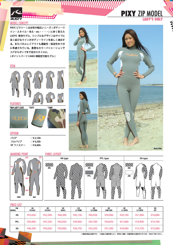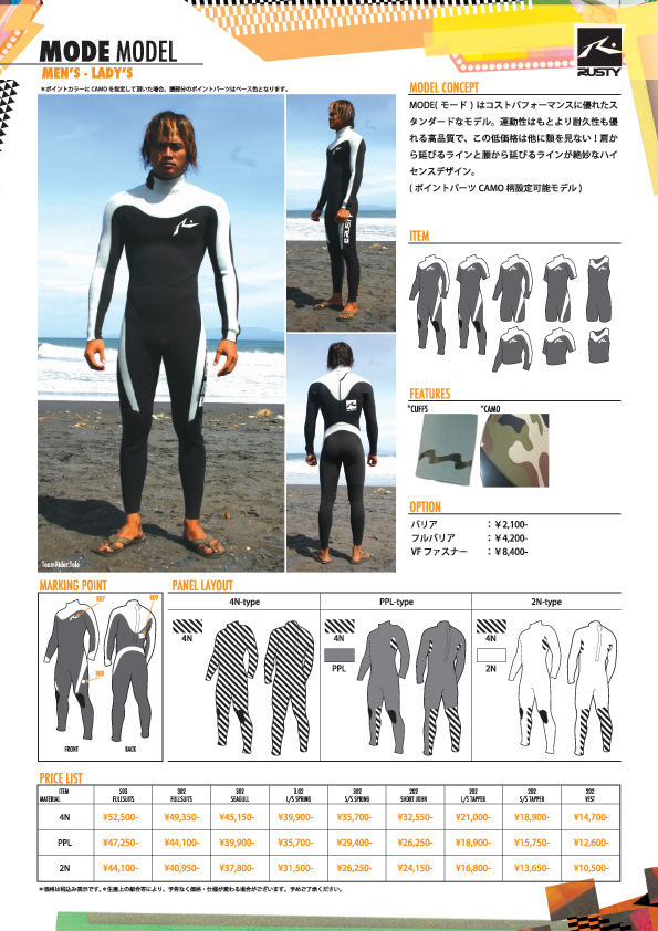 そしてラスティウエットスーツは日本発信で世界中のラスティ ライセンシーに送られています。 この考えはラスティ自身によって考えだされたもので いいものを作る技術のある国から商品を開発し 世界のラスティに広めていこうという考えなのです。サーフボードはアメリカがリーダーシップをとっています。クロージングはオーストラリアが中心になり動いています。そしてウエットスーツは ここ日本が中心になり世界のサーファーに発信されています。 上の写真は今年から新しい製造工程で開発されたMODE(モード)Modelです。 MODE(モード)モデルはコストパフォーマンスに優れたスタンダードなモデル。更にこのモデルに限り、如何なる時もオーダー日より10日以内での仕上がりをお約束。運動性はもとより耐久性も優れる高品質で、この低価格は他に類を見ない!胸から延びるラインと腰から延びるラインが絶妙なハイセンスデザイン。2種類のこだわり起毛素材が選択可能。 MODE(モード)はコストパフォーマンスに優れたスタンダードなモデル。更にこのモデルに限り、如何なる時もオーダー日より10日以内での仕上がりをお約束。運動性はもとより耐久性も優れる高品質で、この低価格は他に類を見ない!胸から延びるラインと腰から延びるラインが絶妙なハイセンスデザイン。2種類のこだわり起毛素材が選択可能。 ARC(エアーコントローラー) ソフトなポリエステル中空糸が、軽量で高伸縮を発揮し、超撥水を施すことで保温効果と速乾性を実現しました。また、皮膚表面の水分を吸収し発熱効果をもたらす繊維を使用。繊維とゴムの間には遠赤外線で血流効果を高め疲労を軽減する働きをもつナチュラルセラミックスをコーティング 。 ARE(エアーエナジー) ポリエステル糸を使用することで水切れがよくディンプル構造が肌へのベタツキ感を軽減し、なお且つ中空糸による軽量化と保温効果を実現しました。また吸湿発熱保温効果を約束します。。 2N コストパフォーマンスの高いナイロンポリエステルジャージを使用しスタンダードなジャージより伸縮性が250%アップ。また、耐久撥水加工を施し速乾性に優れています。 *ご注文を弊社が確認させて頂いた曜日より換算して10日間(弊社休業日を除く) その他にもドライスーツなども発売中 >>ラインナップをご覧下さい!! お近くのラスティディラーにてお求めください。 先日 モードモデルをテストしてきました。使用生地はARC(エアーコントローラー)従来のものより撥水がよく、乾きが早い。動きも非常に楽で特に肩周りの動きは 人間工学に基づいたカッティングにより バネを使用しているような感じでパドリングが想像以上に早い。保温力は季節がら暑すぎるぐらいでした。価格以上の高品質です。 ¥54.600(税込) RUSTY-JAPAN KAMA PR 少しづつではありますが、春の気配がようやく感じられるようになった今日この頃。我々サーファーが一番辛い、寒い・冷たい海からもうすぐお別れできますね!いやぁ~今年も長い冬でした。と言ってもまだまだ水温は上がってきませんが・・・。外気が暖かくなって、気持ち的にはもちろん、着替え時のあの鳥肌とはもうおさらばです。